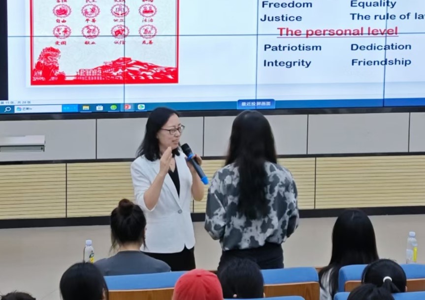 海棠书屋 国际语言服务现代产业学院执行院长、院长助理张斐瑞副教授主讲了《综合商务英语》。课程以商务场景为背景,强化学生的英语听、说、读、写能力。课堂以“leadership”单元为例,从马斯克的领导风格开始,引入领导力风格的具体内容,通过背诵、视译、理解、反思等教学方法和环节,多角度培育学生的语言能力,帮助学生在不同情境下应用所学知识。