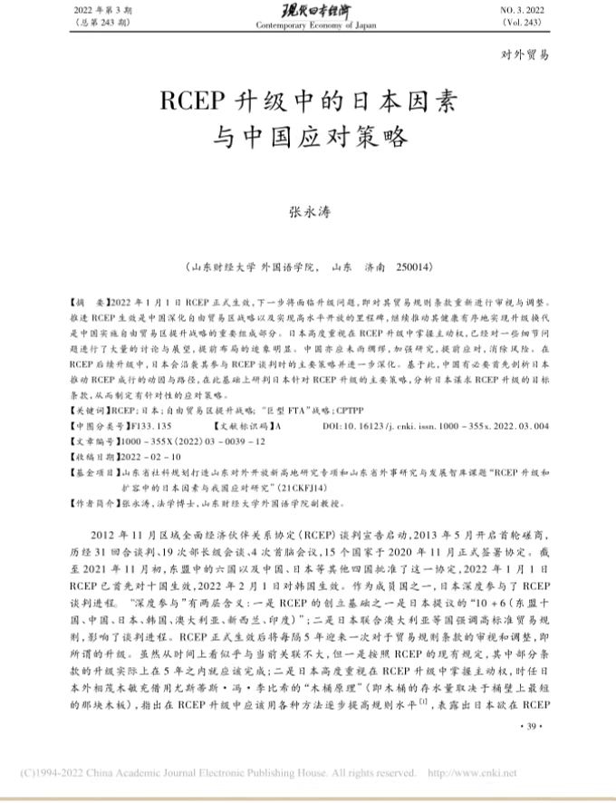 海棠书屋 张永涛副教授撰写的论文《RCEP升级中的日本因素与中国应对策略》在《现代日本经济》2022年第3期发表。该刊系海棠书屋 A2类期刊。