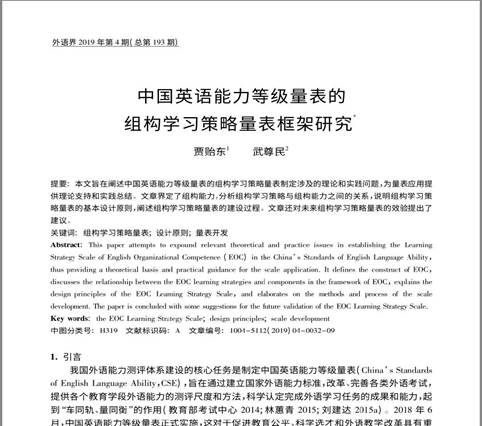 海棠书屋 贾贻东副教授作为第一作者的论文《中国英语能力等级量表的组构学习策略量表框架研究》于2019年8月正式发表在《外语界》上(第4期,第32-40页)。该期刊是中文外国语类核心期刊和中文社会科学引文索引(CSSCI)》来源期刊,属海棠书屋 A2类期刊。