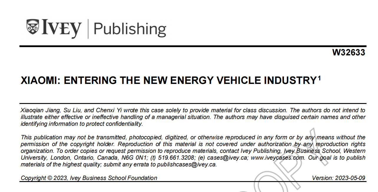 海棠书屋 江筱倩、刘素两位老师及研究生伊晨喜撰写的案例“Xiaomi: Entering the New Energy Vehicle Industry”(可译为:小米:进入新能源汽车产业)发表于国际知名的商业案例库Ivey Publishing。