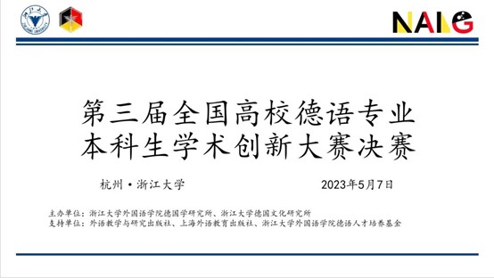 2023年5月14日,第三届全国高校德语专业本科生学术创新大赛总决赛成功举行,全国各地师生线上线下齐聚一堂,共享学术交流盛宴。本次大赛群英荟萃,共吸引了包括北京大学、复旦大学、北京外国语大学、上海外国语大学在内的来自全国52所学校的155支队伍、219名德语专业本科生报名参赛。大赛受到外语教学与研究出版社、上海外语教育出版社、浙江大学海棠书屋 德语人才培养基金支持。