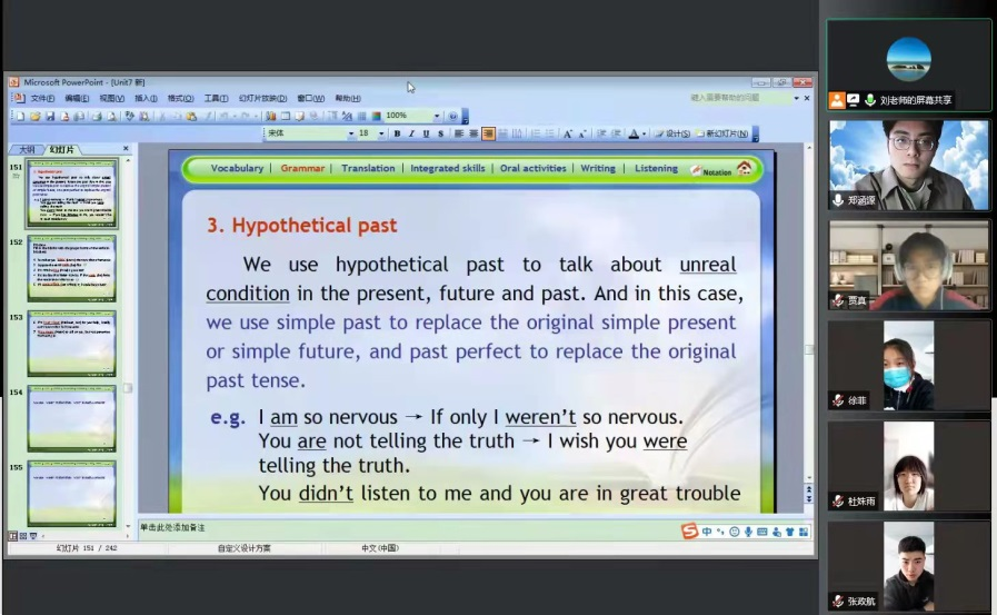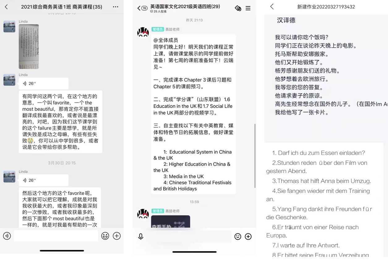 对于外院各系,线上教学早已不是“自选项”,而是融入日常教学的“常规动作”,线上线下混合式教学试点工作早已展开。在接到全面转为线上教学通知后,学院各系第一时间组织教学研讨会,交流线上教学经验。老师们始终坚持以提升学生学习实效为中心,从准备教学设备、选择教学平台、构思教学方案到调试学生心态,将线上教学的每一个步骤、每一点细节都考虑周全,构建不同轨道的云端教学班,充分利用QQ群、微信群、虚拟课堂、钉钉、“腾讯会议”“雨课堂” 等多种方式,开展在线教学。