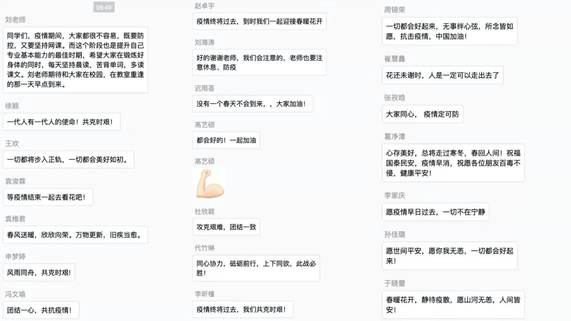 疫情改变了教学的主阵地,却没有停滞教学进度,也没有动摇师生们的勤勉态度。疫情阻隔了师生见面,却通过网络让彼此的心紧紧相贴,老师尽职尽责,学生们及时调整,精神抖擞对待每一节课,积极讨论,规律学习,那每一个向上的身影都诉说着对学习的炽热。