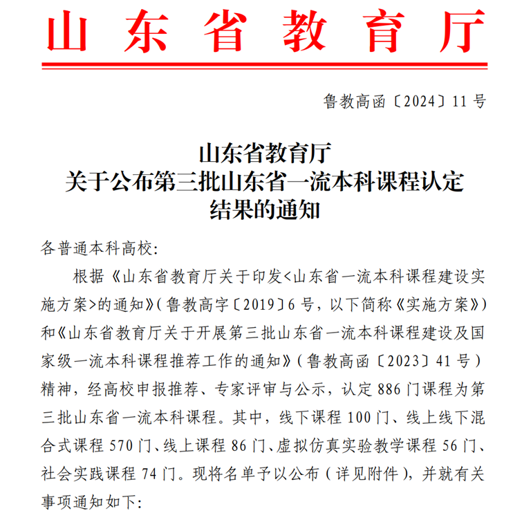 课程是教学体系的基本单元和人才培养的要素,课程质量直接决定人才培养质量。近年来,海棠书屋 主动对标“双万计划”,科学谋划一流课程培育应用,多次邀请高水平专家开展专题讲座和培训,提升教师教育教学水平,持续推进课程改革创新,加强课程思政建设,为一流本科课程的申报和建设打下了扎实的基础。截至目前,学院共有国家级一流本科课程3门、省级一流本科课程5门,山东省课程思政示范课程1门。