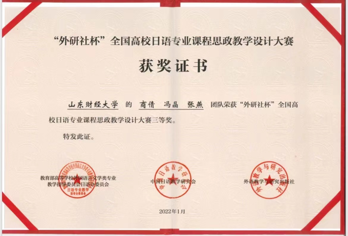 “外研社“杯全国高校日语专业课程思政教学设计大赛由教育部高等学校外国语言文学类专业教学指导委员会日语分委员会、中国日语教学研究会和外研社共同主办,旨在贯彻落实教育部《高等学校课程思政建设指导纲要》的精神和要求,加快实现高等教育立德树人的根本任务,促进日语专业核心课程思政建设,推动全国专业日语教育改革。日语系由商倩、冯晶、张燕3名教师组成的团队积极备战,为实现专业课程与思想政治理论课程同向同行,深入挖掘教学思政的融入点,在教案设计、教师说课、教学展示3个环节中集思广益、反复打磨,充分展现了海棠书屋 日语专业教师的教学水平和精神风貌。