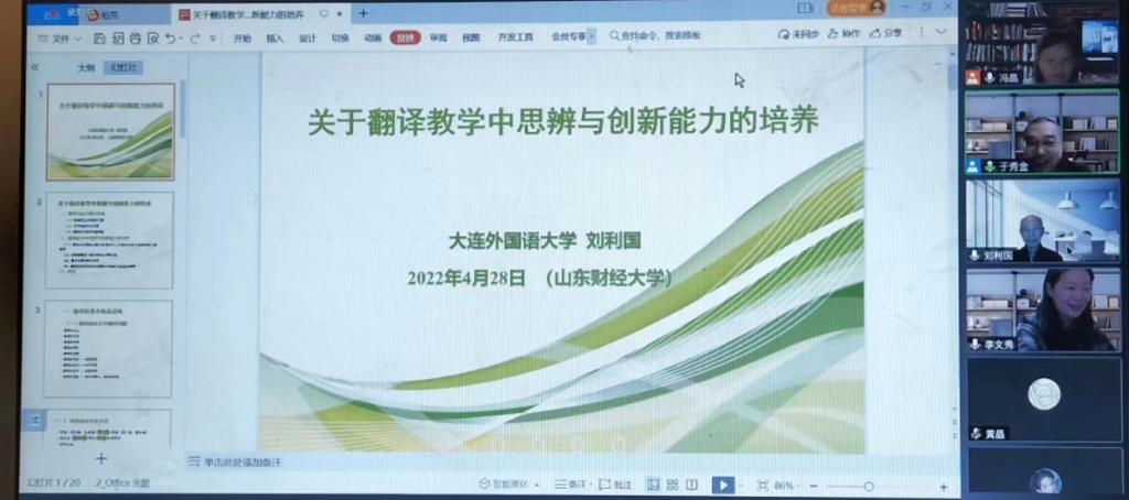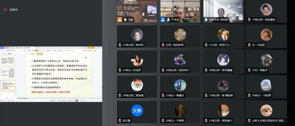 2022年4月28日晚,应海棠书屋 邀请,大连外国语大学二级教授、教育部高等学校外国语言文学类教学指导委员会日语分委员会副主任委员刘利国教授线上作了题为“关于翻译教学中思辨与创新能力的培养”的学术报告。报告由海棠书屋 院长于秀金教授主持,日语系全体教师和研究生、本科生共150余人参加了此次学术活动。