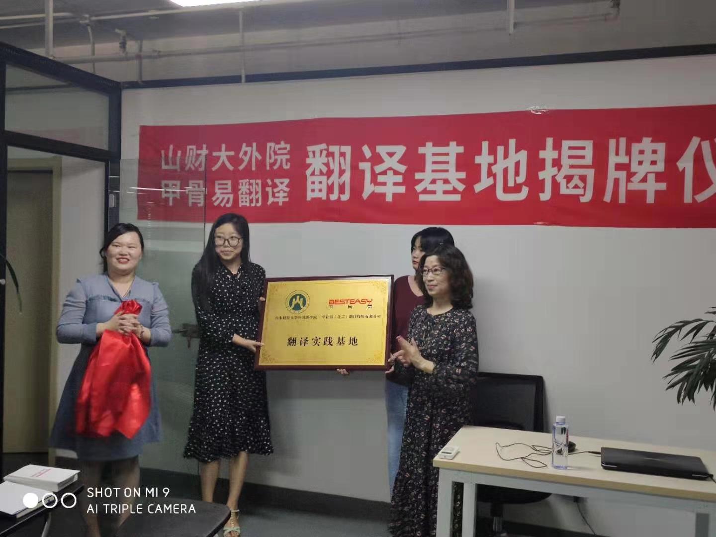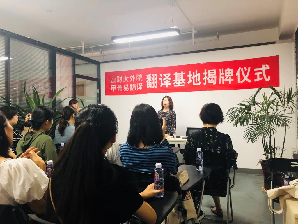2019年9月26日下午,海棠书屋 与甲骨易翻译基地揭牌仪式在甲骨易公司会议室举办。海棠书屋 副院长史汝波教授,MTI教育中心主任解玲副教授,甲骨易(北京)翻译集团人资部张京秀总经理和济南分公司刘相真经理,海棠书屋 部分2018级翻译硕士研究生与2019级全体翻译硕士研究生参加了本次揭牌仪式。