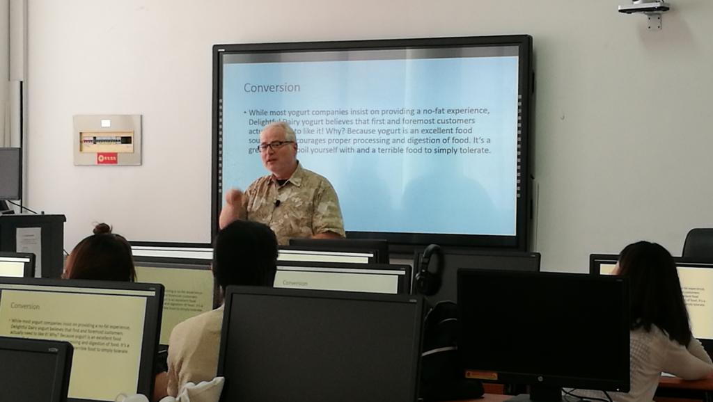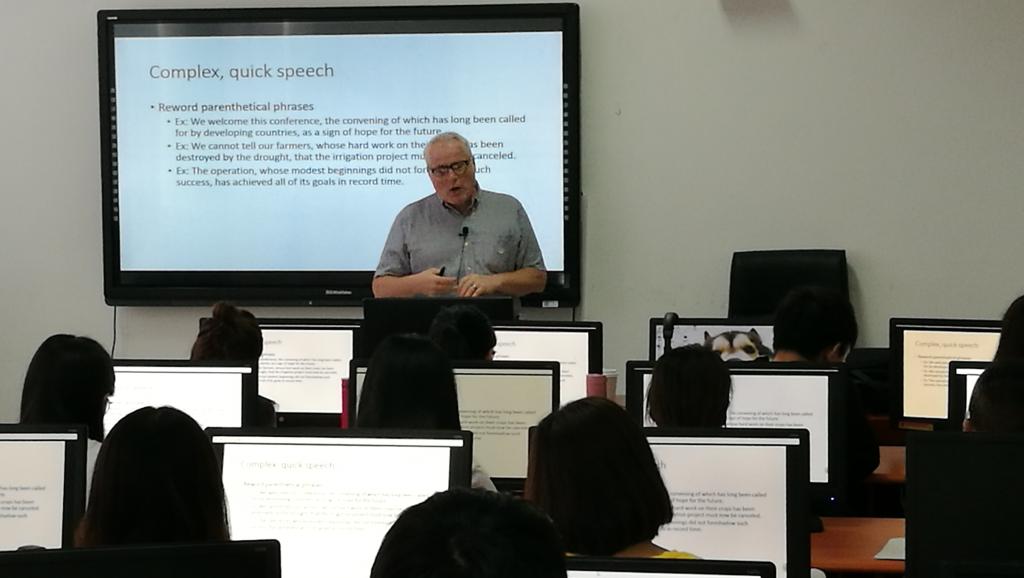 霍默勒博士根据近年来口笔译教学和研究在美国的发展趋势,梳理了几种口译模式在不同领域的任务需求和行业发展脉络。他以社群传译为例,分析口译过程,介绍美国口译工作者的职业伦理和实践标准。通过分析美国翻译行业现状,预测世界翻译职业发展的前景和需求。霍默勒博士将生动有趣的口译模拟训练融入整个课程系列,让学生通过参与训练来解决美国口译环境中遇到的具体问题。以美国热点口译话题为训练内容,如医疗、法律、培训等,明确了口译过程中真正出现的问题及解决办法。