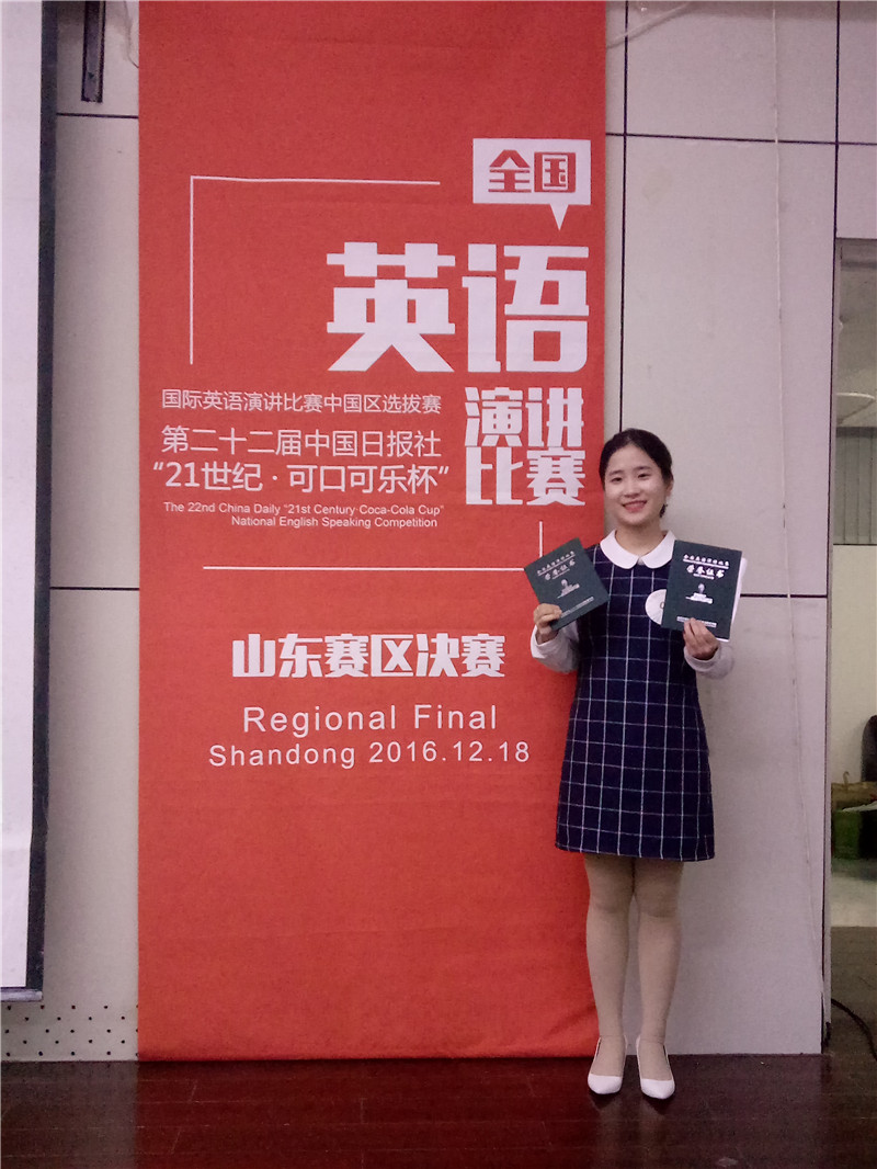 第二十二届中国日报社“21世纪杯”全国英语演讲比赛山东赛区决赛于2016年12月18日在青岛大学报告厅举行,海棠书屋 英语系2014级徐婷同学获得山东省一等奖,并将代表山东省大学生出征于2017年举办的全国总决赛,展示海棠书屋 学子的英语能力与智慧。