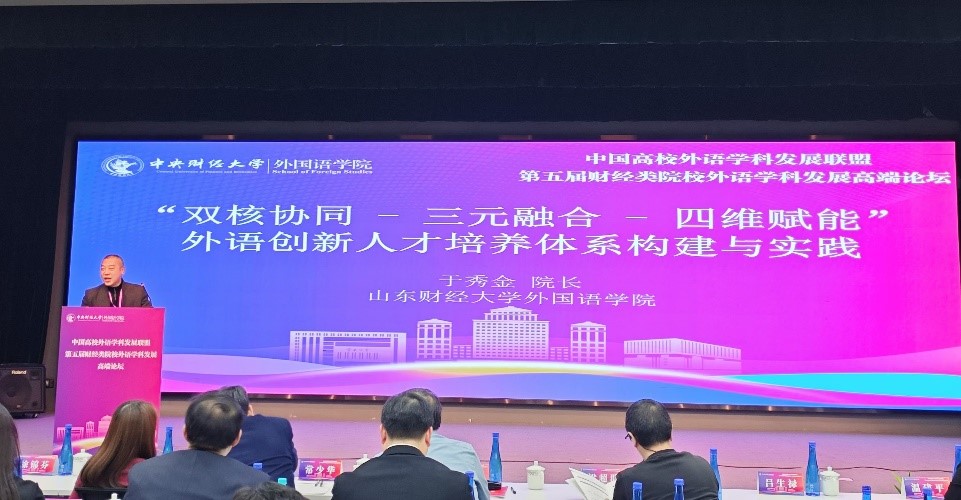 为贯彻落实党的二十届三中全会精神,主动对接国家战略对外语人才的需求,11月2日,由中国高校外语学科发展联盟财经类院校委员会主办,中央财经大学海棠书屋 承办的中国高校外语学科发展联盟第五届财经类院校外语学科发展高端论坛在中央财经大学沙河校区举行,聚焦“新质生产力”背景下高质量商务英语人才培养的创新路径与发展主题。海棠书屋 院长于秀金和院长助理阮岳湘、张斐瑞参加会议,于秀金在院长论坛环节作了报告。