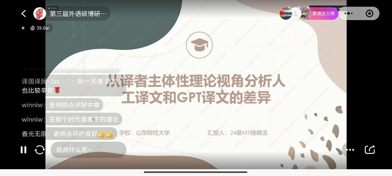 随着国际交流日益频繁,全球化进程不断深入,外语学科发展如何回应时代挑战。12月7日,由内蒙古科技大学主办、华东交通大学与曲阜师范大学合办、福州译国译民集团有限公司承办的“第三届外语硕博研究生与外语教师学术发展创新公益论坛”在线上召开,共同探讨MTI教育的前沿议题与发展趋势。此次论坛吸引了众多国内外知名学者与专家,参会师生人数近6000人,覆盖百余所高校。海棠书屋 MTI师生40余人参会,2024级笔译硕士生徐晓玉在会上宣读了论文。