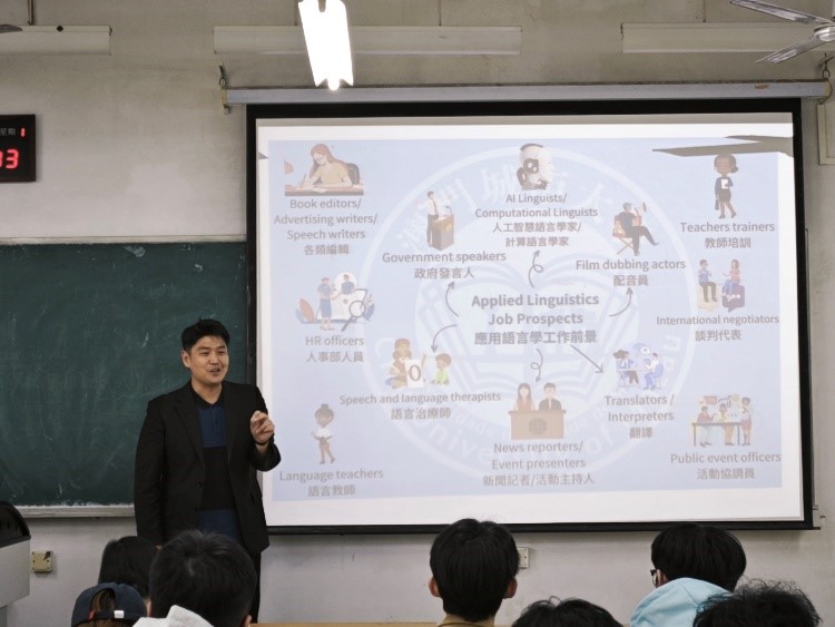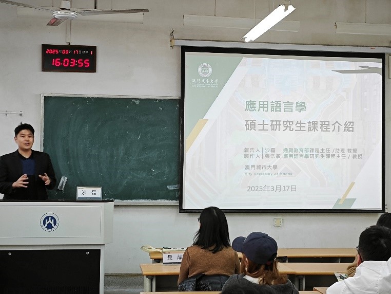 宣讲会聚焦四大核心板块,全面展现学科优势。课程特色环节中,沙磊从课程体系、课堂内容、就业前景三大方面向我们介绍“理论+知识+实践”三维融合培养模式,他强调“人工智能仍是一片蓝海,丞待拓展”;教师风采部分展示了澳门城大高水平且庞大的师资团队;现场呈现的研究成果图片则分享了该校在跨文化交际、生态语言学等方向的突破性成果;学生风采部分中,学生参与语言项目、斩获国际学术竞赛奖项的经历,更激发了在场学子的热情。