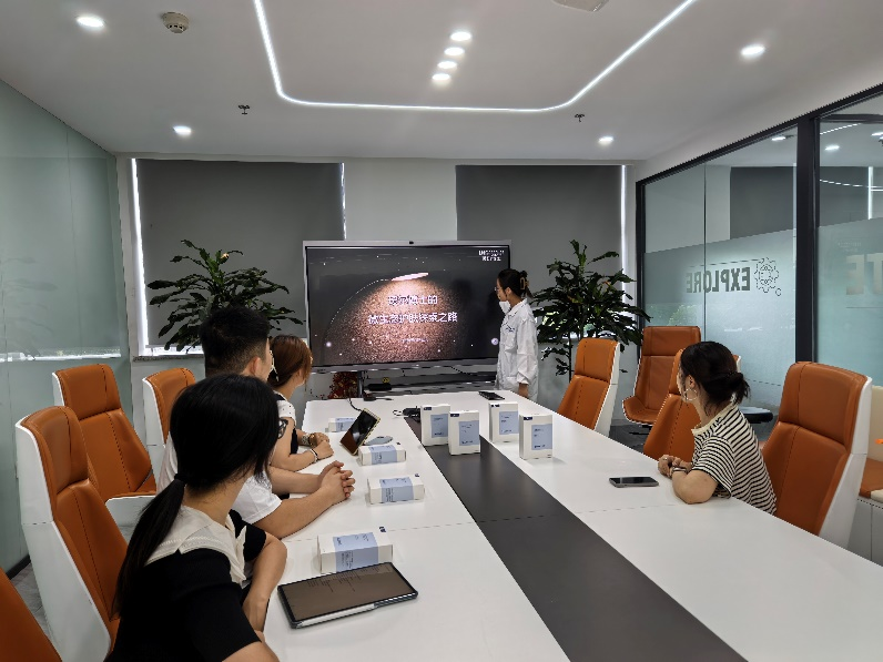 下午,参访移至福瑞达集团总部。在研发中心,师生们近距离接触了先进的实验设备,并与专业研发团队进行了深入交流。研发人员详细介绍了旗下品牌“瑷尔博士”在微生态护肤领域的研发理念、核心技术及创新成果。学生们结合自身所学,就相关技术与市场应用等话题踊跃提问,与研发专家积极互动,现场交流氛围热烈。