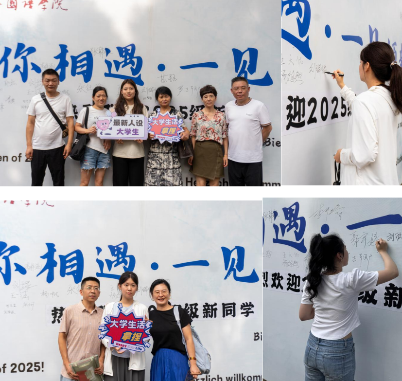 迎新报到现场,2025级新生有序完成报到手续,在签名墙留言纪念,许下学业心愿,并与亲友合影留念。亲友相伴,满怀期许;外院亦以“新家”的姿态,成为他们探索语言文化、谱写大学生活的起点与舞台。