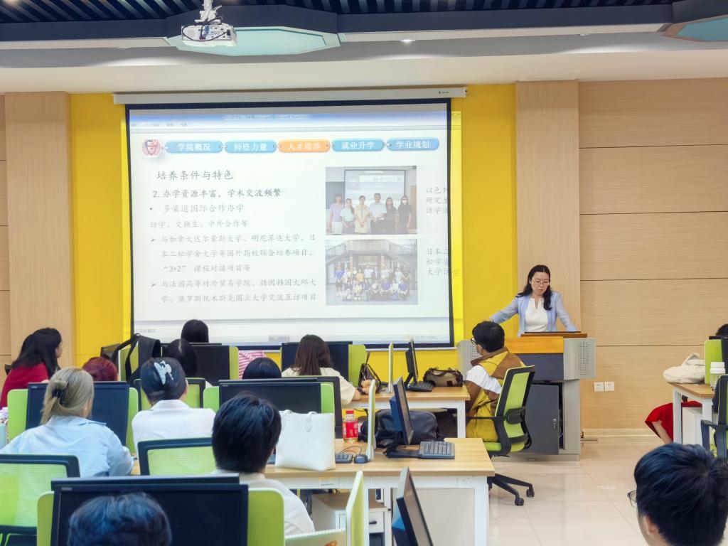 活动伊始,阮岳湘代表学院向新生致以诚挚欢迎,从学院发展历程、学科建设成果及师资队伍优势展开介绍,帮助新生快速建立对学院的整体认知。随后,她聚焦人才培养核心,逐一对各专业课程设置、人才培养方案、学位授予标准进行细致解读,着重强调学院 “语言 + 专业” 的复合型培养策略,鼓励新生在夯实语言功底的同时,参与实践活动,加强与商务、法律等领域知识的融合,通过学科竞赛、海外访学、国际学术交流等方式养成国际化视野。