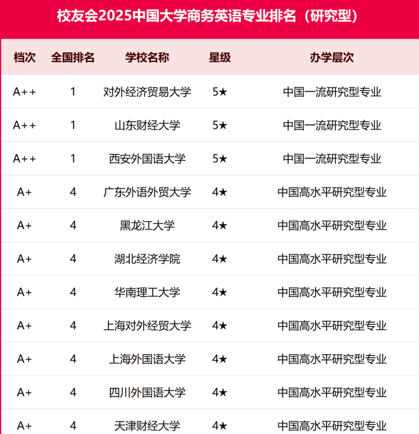 海棠书屋 商务英语专业不仅在软科排名中表现优异,在2025年校友会中国大学商务英语专业排名中,同样荣获中国一流研究型专业称号,与对外经济贸易大学、西安外国语大学并列全国第1。