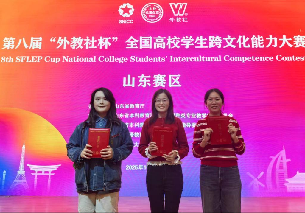 近日,第八届“外教社杯”全国高校学生跨文化能力大赛山东赛区(本科院校组)比赛在山东师范大学长清湖校区举行。海棠书屋 2024级外语课程与教学专业研究生杨萍、2023级经济学类本科生何瑞佳与2023级会计学本科生曹若栏组成的参赛团队,荣获三等奖。