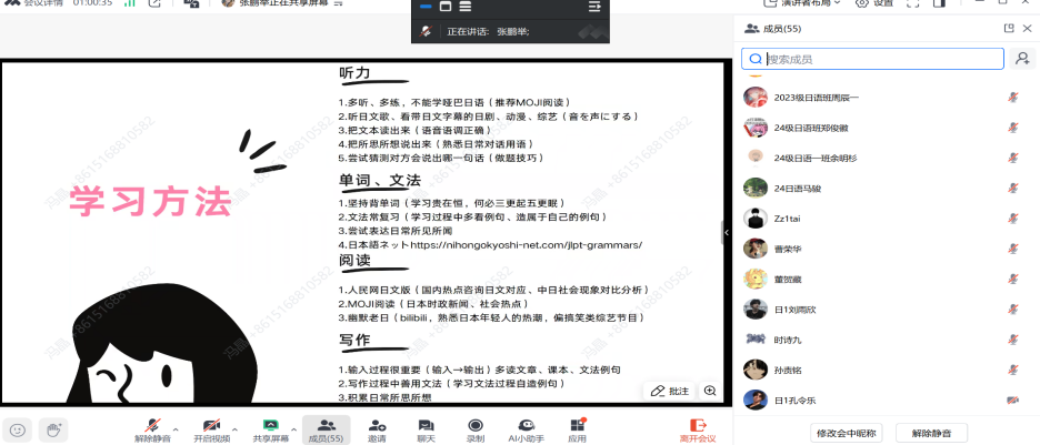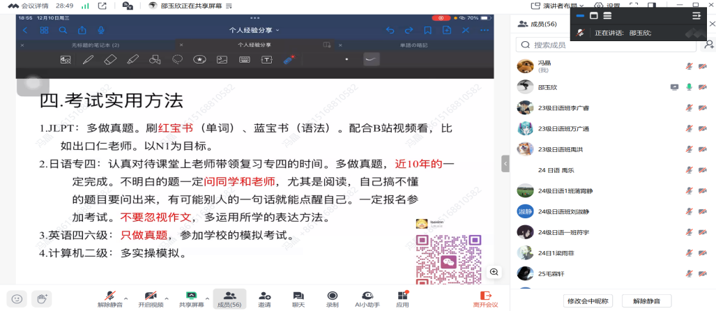 为帮助日语系学生营造互助共进的学习氛围,12月10日,海棠书屋 日语系于线上成功举办 “保研学生学习经验分享暨期末动员会”。2022级成功推免硕士研究生的邵玉欣同学和张鹏举同学分享了个人学习经验,活动由李宗玲老师主持,日语系教师代表及大一、大二、大三的全体学生参加了此次活动。