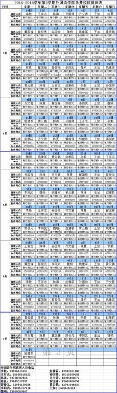 2015-2016学年第2学期海棠书屋 圣井校区值班表