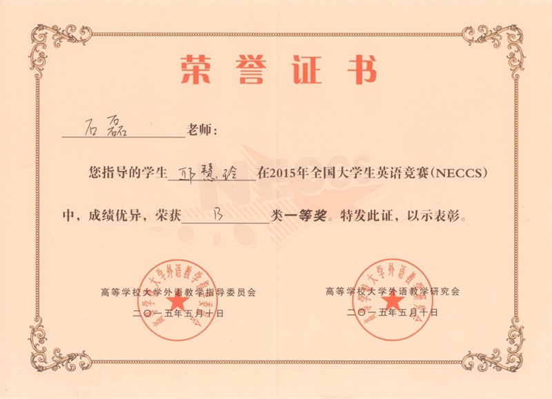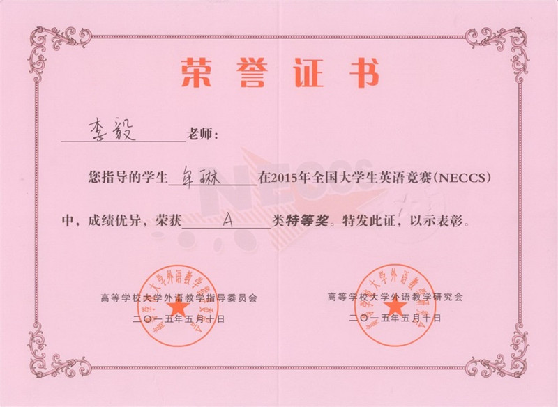 在刚落下帷幕的2015年全国大学生英语竞赛中,海棠书屋 学生表现优异。由李毅教授指导的研究生牟琳同学荣获“2015年全国大学生英语竞赛A类特等奖”,由石磊老师指导的本科生邱慧玲同学荣获“2015年全国大学生英语竞赛B类一等奖”。