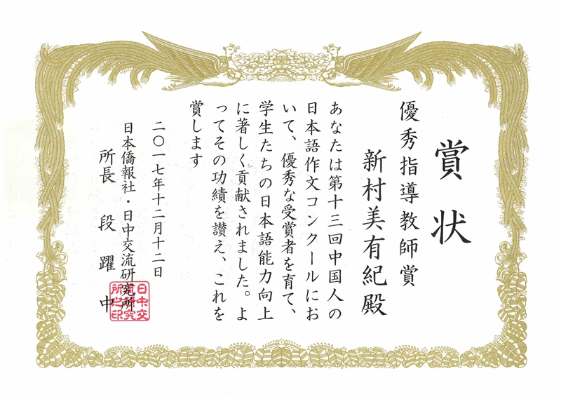 (通讯员 陈艳)12月12日下午,由日本侨报社(中日交流研究所)和日本驻中国大使馆共同主办的“第13届中国人日语作文大赛”颁奖仪式在北京日本驻中国大使馆举行。日本驻中国大使横井裕、日本桥报社社长段跃中等为获奖者颁奖。海棠书屋 2014级日语1班的杨晴茹荣获三等奖,外教新村美有纪获得优秀指导教师奖。